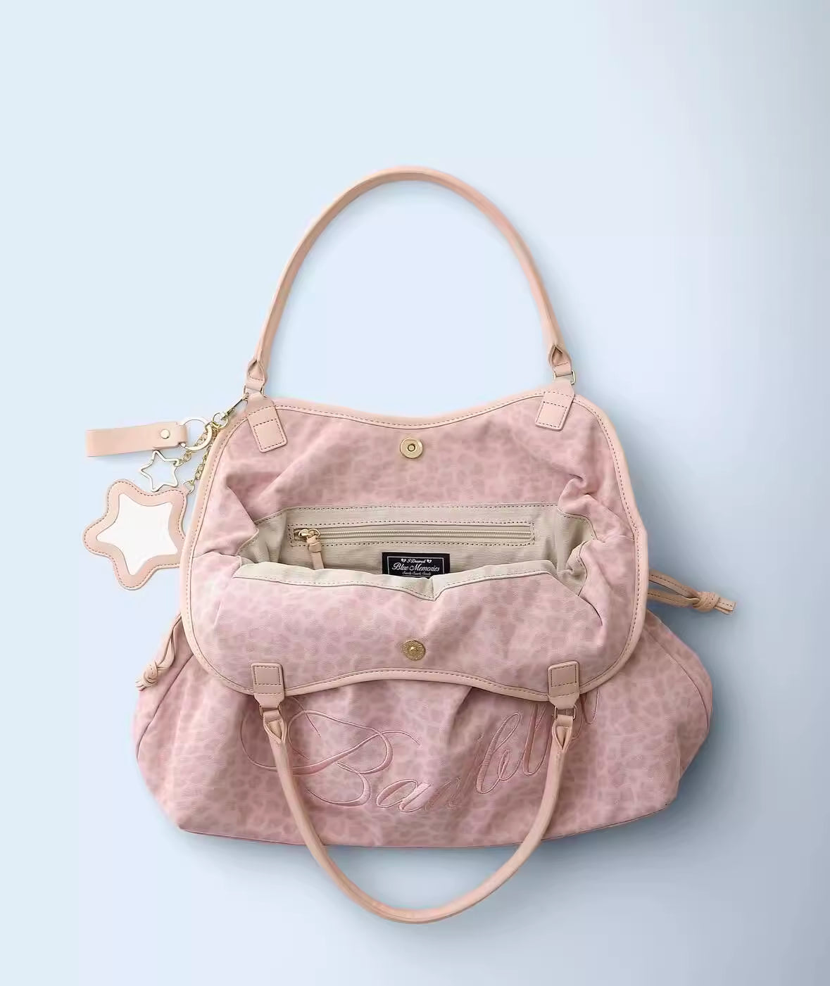 Large soft-structured tote with BadBlue lettering and playful prints, designed for daily carry with a sweet–cool Mori Girl vibe.