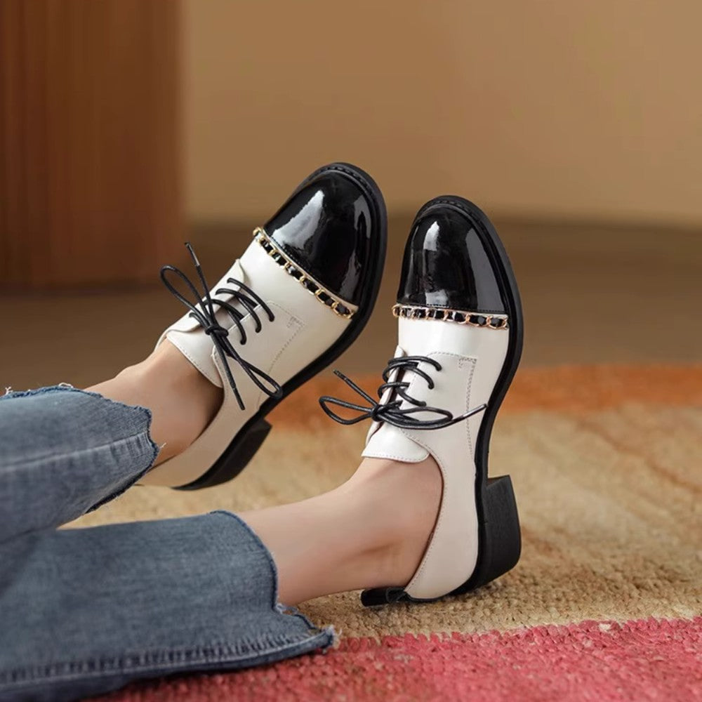 Stylish color-block genuine leather shoes featuring a glossy round toe, lace-up design, and a chic chunky heel.
