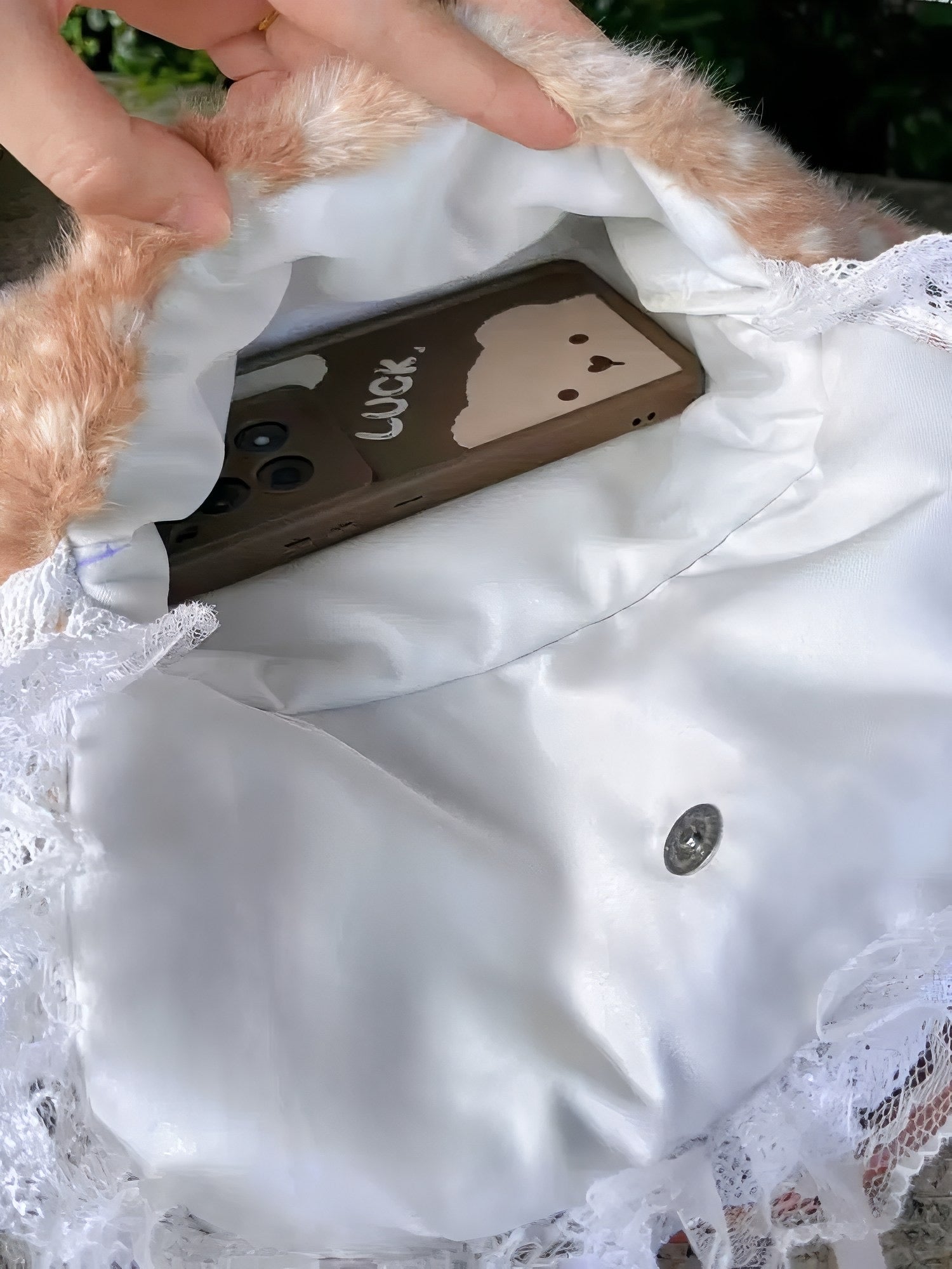 Soft plush handbag with delicate lace trim and fawn-inspired texture, blending cozy charm with a vintage commuter style.