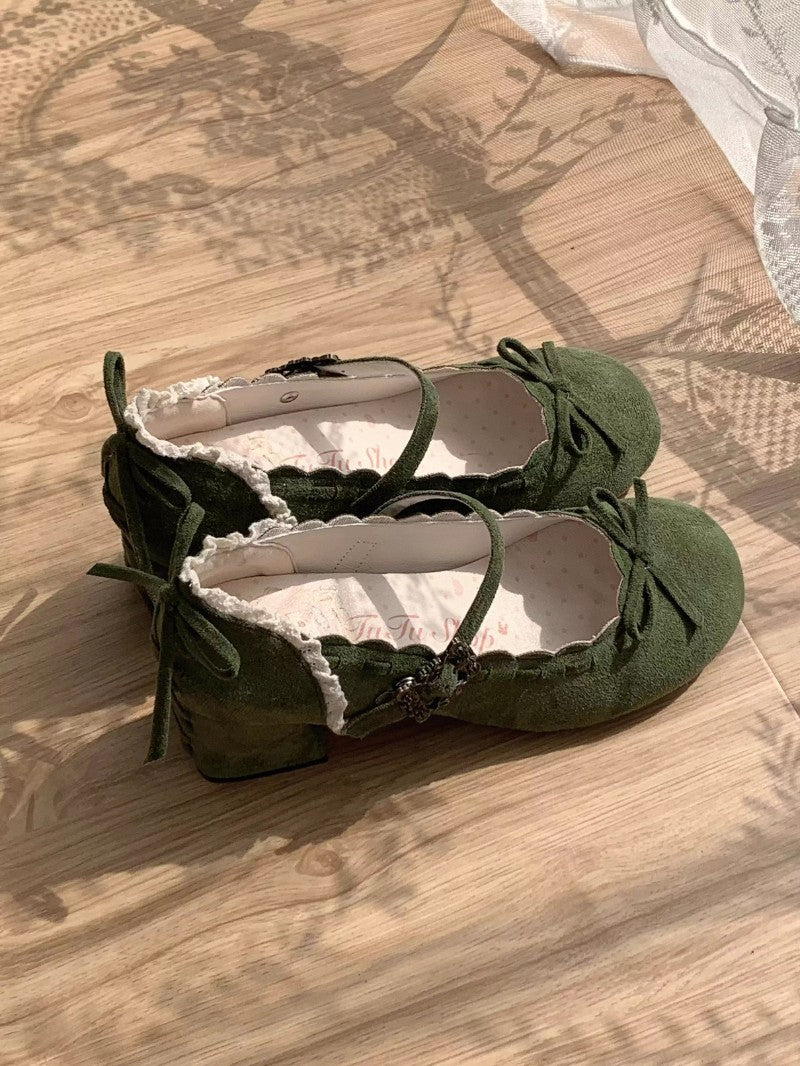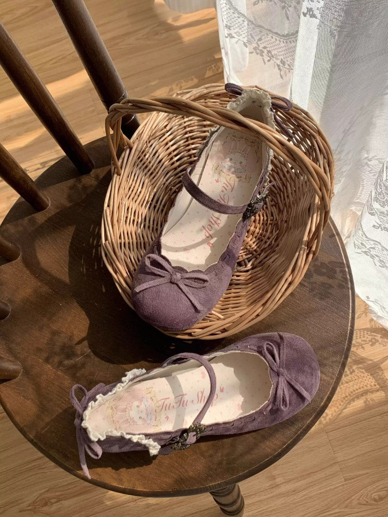 Soft and elegant spring shoes featuring a round toe, suede finish, lace trim, and delicate bow accents.